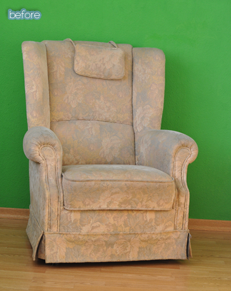 In the meantime, please enjoy the following chair makeovers, first from Sara at It’s Good to be Queen. Her chair was big and comfy and stolen from Santa’s hunting lodge. Not really, but with all that red and green plaid, you never know. She updated it with a natural linen, and although the trellis inserts looked cool, they were a flimsy plastic and not worth saving. Now the whole thing is airy and right instead of merry and bright. (Like the Christmas song? Ha! Get it? Oh, nevermind).