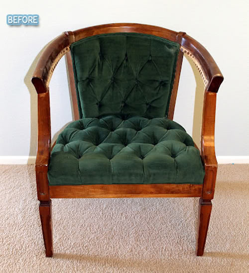 Another chair makeover! Who can resist? Not me. Blair found this chair at Goodwill (on 50% off day, brave girl!) and stripped it to its bones with the best intentions of giving it a worthy makeover. However, the chair proved to be a surprisingly tough (and smelly) contender and Blair had to call in for backup. Luckily her mom came to the rescue and finished sewing the chair up nice and pretty.