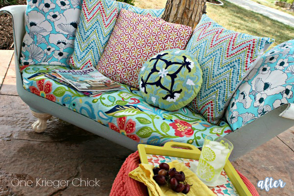 This beige microfiber chaise used to be the definition of boring. Not only that, it really didn’t match the whole vibe going on in the rest of the bedroom. All that was changed with a custom slipcover with gathering galore and a monogram to add a personalized touch. Check it out here at