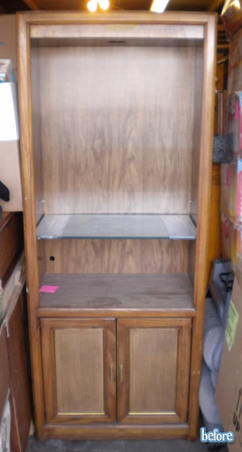 Anyway, here’s the story of two boring hutches…that were given a new life of their own. (See what I mean? Lame.) OK, so since I’m painfully lacking in lyrical talent, I will simply say that they both turned out great. First one comes from Angie at All My Treasures. Looks fresh and charming in black, and I love the lighter interior.