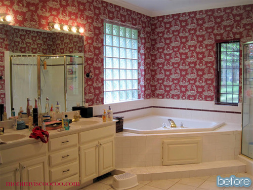 I’m pretty sure nothing from the earlier era of this bathroom survived Val’s renovation. Hooray for that, because after staring long and hard at that before pic, I can’t find one redeeming element worth keeping around. Not the grungy tile, not the beribboned fruit basket wallpaper border, not even the towel rack was worth saving! I just love the after, so simple and stunning. I love how they only framed the top and bottom of the mirror for a more modern effect, and how about that faucet? Showpiece! Lots more to see on her blog, Until Tomorrow, Val.