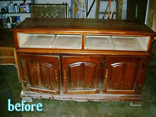 By now we should all know that even the most outdated and stanky furniture can be revived with a coat of paint. But even I would probably have passed this hutch by, thanks to that super 70’s gold detailing on the glass panels.