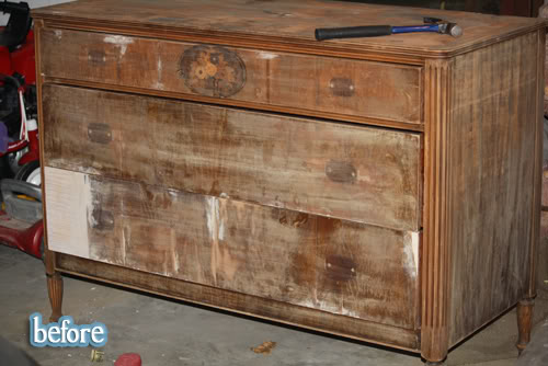 But Sonia just shaved it right off with a razor scraper and yup, you guessed it, transformed the whole piece into a vision in white. Love the knobs and the print lining the back! Check out the details on her blog Sonnie Sue.