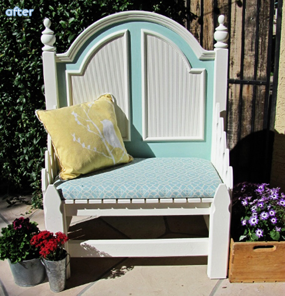 Claire saw the solution to this dilemma from a mile away and simply screwed her three freebie chairs together to form a single unit. She added some Gorilla Glue for good measure, a coat of black spray paint, and a cushion with a cover she made herself to top it all off. Now she has a fabulous piece of furniture, plus bragging rights whenever anyone comes over and says “Well bless my soul, where ever did you get that adorable bench?!”