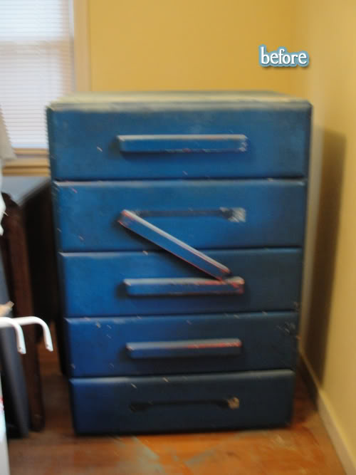 This regal little chest of drawers had been disgraced by years of wear and tear and a sad little patch of Lisa Frank stickers. (This is why I refuse to allow stickers in my house. Call me a mean mom, I don’t care. I’m still trying to remove a giant snowman sticker on my bathroom vanity from the previous owners, and we’ve been here over 2 years).