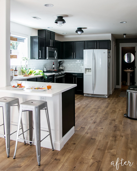 But, sometimes a little risk pays off. Why not ask if your landlord will let you paint? (Or … shhhh … just paint anyway! If you are planning on being there a while, why not? Just paint it back before you move out. I won’t tell.) Karen not only repainted her kitchen, a huge improvement over the previous sins of gold and aqua, but she added a stainless steel backsplash with … contact paper?! True. Check it out on her blog Lease to Decorate.