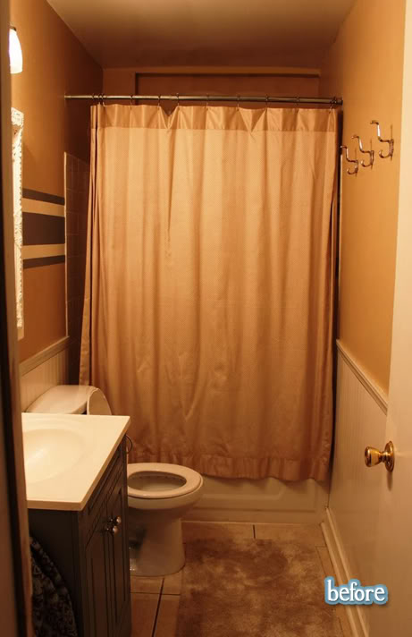 Julie knew her laundry/mud /storm/bath frankenroom was only temporary until it could be turned into the fantastic real-deal bathroom of dreams that it is today. Yup, that is the very same space. How about that dresser turned vanity, eh? I’m sure no one is missing that haunted hospital sink. Can you even spot the extra piece of trim her husband had to attach to the dresser front to make the sink fit? Very sneaky! Check it out on her blog Thrifty Chic Designs.
