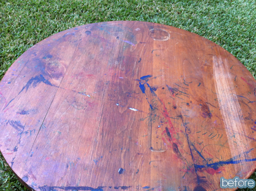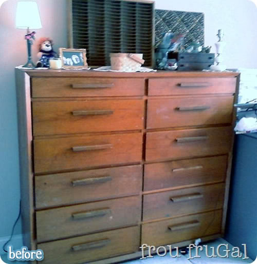 Bonnie’s buffet was beautiful, but battered. Ok, so it’s not really a buffet, but I needed to alliterate there. Ok, so alliterate is not a verb. Whatever. Oh snap, I just checked Dictionary.com and it IS a verb. Double snap. Anyway, so back to Bonnie. She gave this vanity a double color treatment with Annie Sloan Chalk Paint, starting with Antibes Green for the whole piece, then going over the details with Duck Egg Blue, which really make the urn and olive leaf details stand out so nicely. Love it! See more on Bonnie’s blog a wee Meenit.
