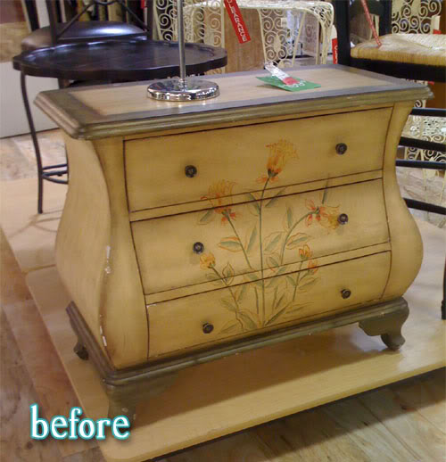 Better After reader Carla refreshed this stale old dresser into a sweet little changing table with a coat of black and some new fluer-de-lis knobs. I almost thought they were hand-painted flourishes; a little touch of trompe l’oeil, which my one semester of French taught me means “trick of the eye.” And even though that phrase refers to a style of realistic painting, this still kind of WAS trompe l’oeil, because my eyeballs were tricked all the same. I have no idea how to pronounce that, so let’s not ever have this conversation in real life.