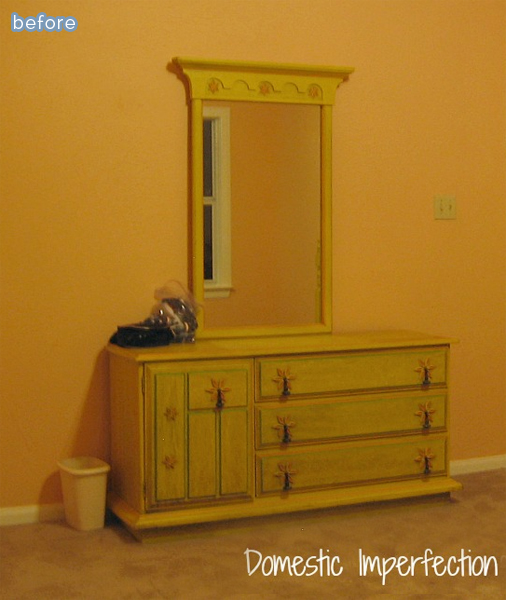 But she decided there was a little hope left, and once the swirly plastic doors were removed, things started looking better. With a coat of Horseradish and an extra special touch: frosted glass door inserts, it’s a table to be proud of! Thanks Jana!