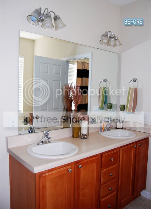 January 26, 2012 at 7:44 AMI don’t think the cabinets are bad! (And I am quite picky when it comes to cabinets) they obviously aren’t my favorite.. but they look fine to me! And the cost of replacing them….. love the mirror