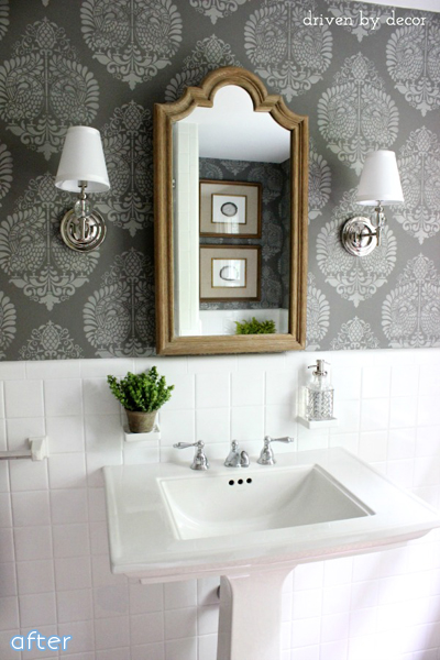 But hold on to your hats, because a mere $25 worth of Rustoleum Countertop Paint later, and it’s the official opposite-of-scary. Add the black and white stencil, and it’s entered a whole ‘nother stratosphere of cool. Check it out on her blog Kammy’s Korner!