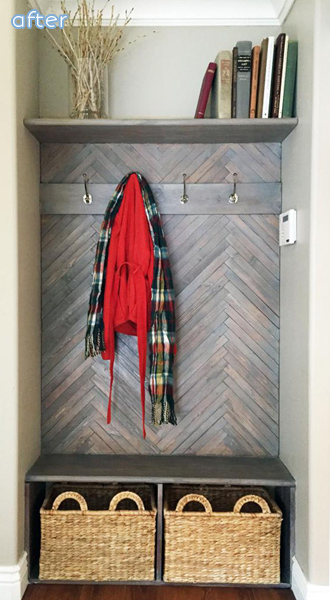 Gemma also had a boring ceiling on her hands … or head … or whatever. She was inspired to try a herringbone pattern and made the whole process look easy, even for those of us who may be challenged by math … (or counting) … (or painter’s tape). It’s the perfect punch of interest for this little space. I think I have ceiling envy. See more on her website The Sweetest Digs.