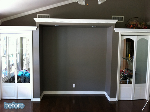 This before picture was from Rita’s first walk-through of what is now her home. Obviously, she was able to see past that pukey mint color on the walls and the perversely unattractive valences. They’re like mustaches for the windows! She de-creepstered them by hanging bamboo shades instead, and gave the whole room a neutral palette to serve as a backdrop for her colorful accessories. Would you believe the yellow windows haven’t changed? I think the color of the walls isn’t such a jarring contrast anymore that you hardly notice them. Pretty cool! See more on her blog This (Sorta) Old Life.