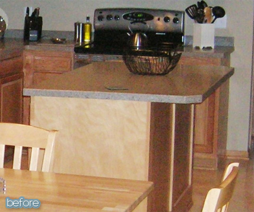 Some people want an island getaway, and some people want to get away from their island. I want both. My kitchen island – which I’ve surely whined about before – drives me bonkers. It looks very similar to Emily’s here: basic, builder-grade, and featuring those stupid veneer sides that don’t come anywhere close to matching the rest of the cabinetry. Oh, and mine has some attractive water damage too. Don’t be jealous.
