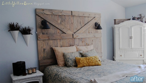 February 15, 2013 at 2:51 AMThe barn door headboard is wonderful and perfect size for the wall. I find myself putting too much on a wall when all it needs is one large piece. Cute heart fabric chair too.
