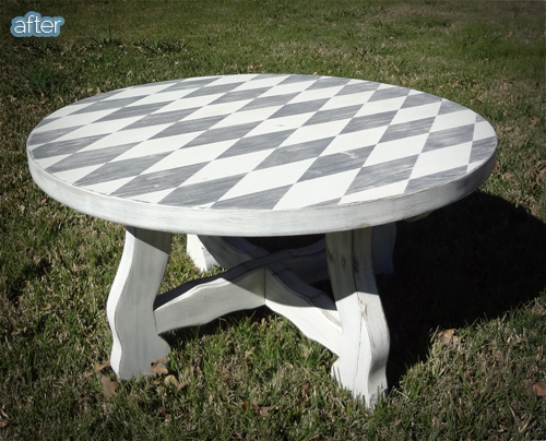 Looking for a quick and easy way to update a table or somesuch? Look further! These tables are neither quick nor easy. Because … have you ever tried painting a harlequin pattern? I have. You might think you can just draw a few diagonal lines and wing the rest, but that is not true. There is very much measuring and math and maybe tears involved.