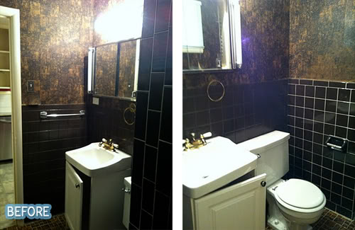 Tiny budget + 20-year-old bathroom = lame-o makeover? Incorrect! You CAN make a big change with chump change, as Jen, aka Girl In The Garage proves here with her makeover of a friend’s bathroom. See, this friend had redone every other space in the house, and the bathroom was the final frontier. Of course, the budget was pretty much gone by then, so the challenge was to find low-cost solutions that would actually make a difference and not be like, “Something’s different in here … did you get new hand towels?”