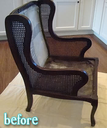 In the meantime, please enjoy the following chair makeovers, first from Sara at It’s Good to be Queen. Her chair was big and comfy and stolen from Santa’s hunting lodge. Not really, but with all that red and green plaid, you never know. She updated it with a natural linen, and although the trellis inserts looked cool, they were a flimsy plastic and not worth saving. Now the whole thing is airy and right instead of merry and bright. (Like the Christmas song? Ha! Get it? Oh, nevermind).