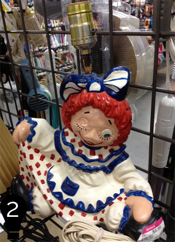Like I said, I received many Raggedy Ann lamps. This one beat out the rest, and bears the scars to prove it. She’s a little unstable. Try not to make eye-contact.