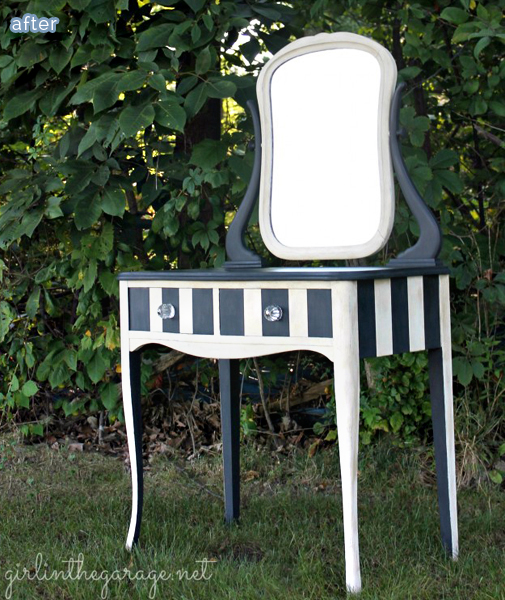 If your primping station could use a little primping herself, sass her up with some black and white stripes why don’t you? Add a couple of fancy glass knobs, contrasting paint on the legs (my favorite part!) and she’ll be the chicest girl on the block.