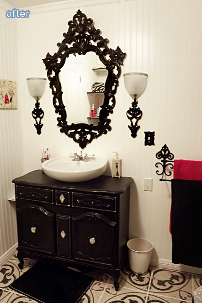 She started off the look by painting this awesome ReStore mirror and adding appliques to the thrifted buffet for the vanity. To complete the look? How about a sequined toilet? Yep, pretty sure the boys will be staying away from that. But don’t worry about them, Eden has already created the manliest mancave bathroom in existence too, right here.