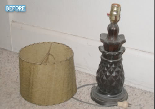 And just in case you wanted to look at another fabulous lamp, (it’s the least I can do after the terrible eyeball abuse you suffered from the Ugly Lamp Contest last month), here’s another one from Jenna at Rain on a Tin Roof. Can an orange, yellow, and brown lampshade work with a bright aqua lamp base? Surprise! Yes!