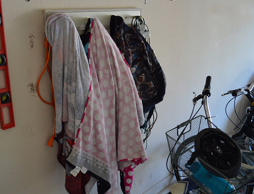 As you can see, this little coat rack in the garage was working overtime. Not only that, it was way too high for the kids to even use, which resulted in an explosion of backpacks and accompanying schoolwork-shrapnel that scattered all over the house as soon as they walked in from school.