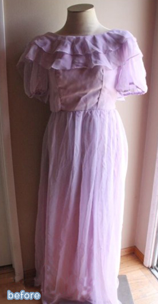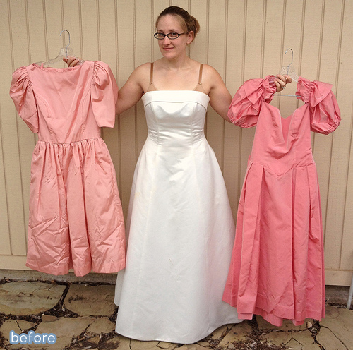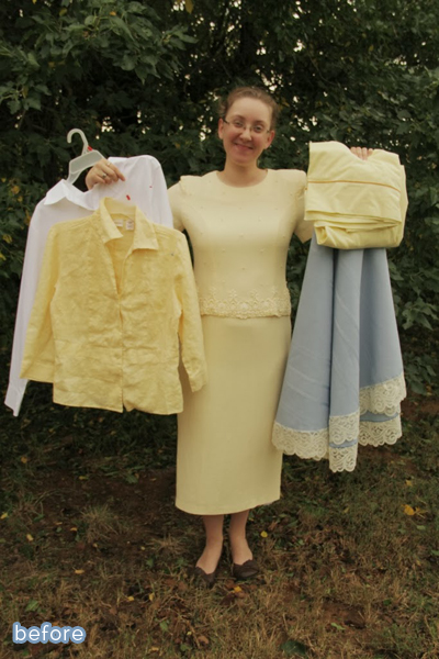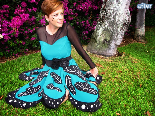 And Trisha from Feeling Kinda Thrifty got in on the Halloween fun too, emerging from the cocoon of these shapeless thrift-store dresses as a beautiful butterfly! What a magical transformation! (Although that green one might have made a nice Statue of Liberty costume too, for those of us who, you know … rely on the glue gun).