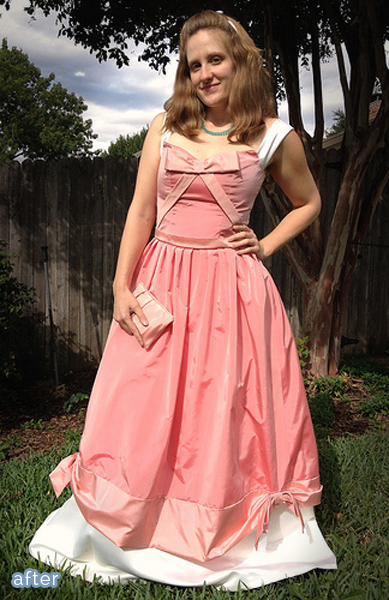 Carissa at Carissa Knits was also inspired by Disney, and set out to make a Cinderella costume with an old wedding dress and two awesomely poofy bridesmaid dresses. But listen here. She wasn’t going for traditional Cinderella with the blue ballgown, no! She wanted to create the look that Cinderella’s little animal friends had re-fashioned for her before her Fairy Godmother ever came around. Such visionaries, those mice and birds.