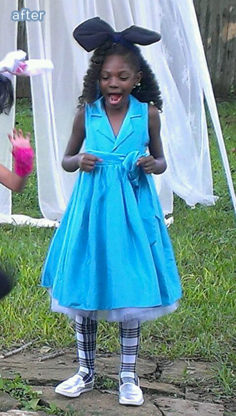 It just took a little bit (ok, probably a lot) of altering for Chantell to turn this woman’s 3/4 size dress into a girl’s size 8. With the addition of a big black bow and patterned tights, her daughter is transformed into a modern Alice in Wonderland!