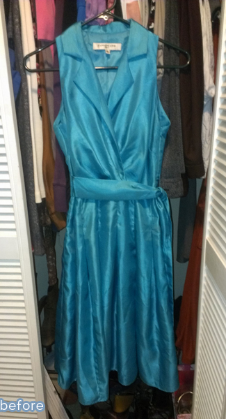So, I simply chopped off the classy faux-leather halter-top (saved the flower) and replaced it with the top half of an old black t-shirt that I sewed in place. I took it in a little on the sides, and now it fits great! The length is just right.