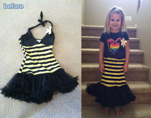Uh-oh, who is this little rapscallion? That’s MY girl! Yep, here is a Fashion Friday offering from yours truly. She wanted to be a bumblebee, and look what I happened to find at Saver’s for $6. As you can see, it was a little on the … adult side. Yipes.
