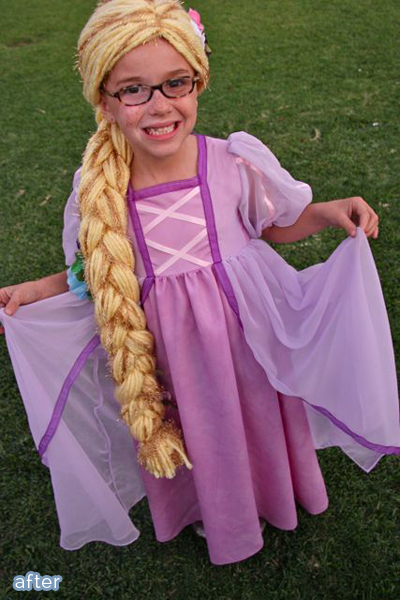 Carrie at This Momma Makes Stuff crafted a Rapunzel costume for her daughter out of little more than a thrift-store prom dress and ribbons. How stinking adorable did it turn out? It’s perfect!