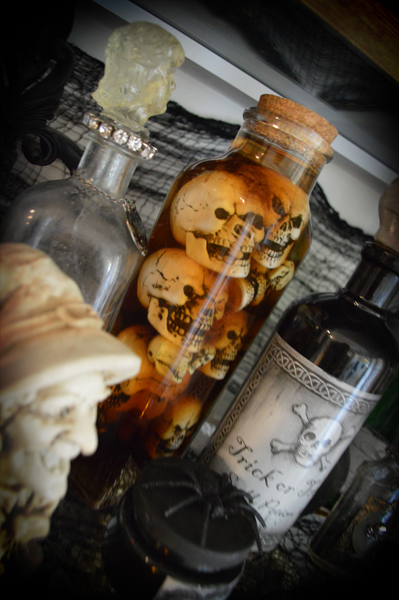 I wanted to do a little apothecary, so I rounded up some old bottles and such from Goodwill and spookified them.