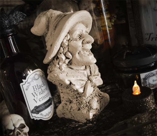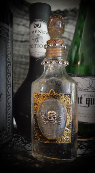 My friend Kelley, aka Queen-of-Halloween, makes these amazing bottles. She made casts of different doll-heads, then filled them with resin and glitter and gifted a couple of them to me. She sure knows the way to my cold, dead heart.