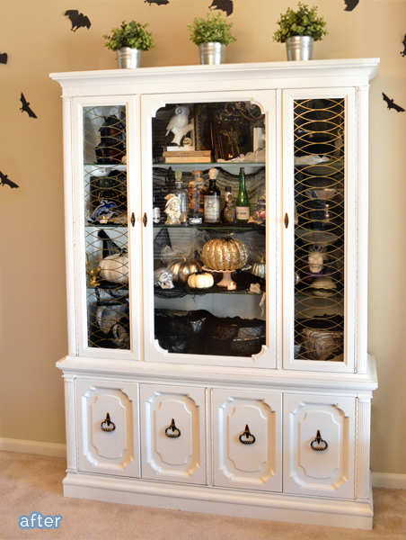 October 31, 2013 at 4:15 PMThe first thing I noticed was the stretching dog. So cute! I wasn’t sure anything could be better, but wow! The hutch wasn’t terrible to begin with but your After is spectacular. I love the hutch on it’s own, but with the Halloween decorations inside, it just looks fantastic. I’m not usually one for “tchotchkes” or much festive decor (which makes my holiday loving husband sad) but I love this!