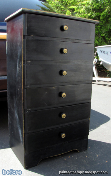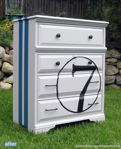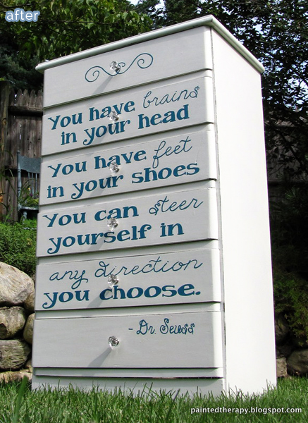 Now, here are a couple inspirational dresser makeovers for you from Debbie at Painted Therapy. I think this first one is inspirational, because it won’t be put in a box! No labels for this girl. Pink and pastel? Nothing wrong with that, but she’d rather play baseball than ballet. Kind of reminds me of my daughter, who loves both. She wants to be a vampire bumblebee for Halloween.