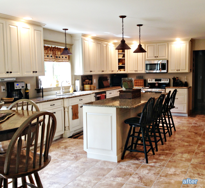 The original owners had planned to tear out the kitchen and put a garage in it’s place, but Kristy kept it where it was. Yep, that’s the SAME ROOM!