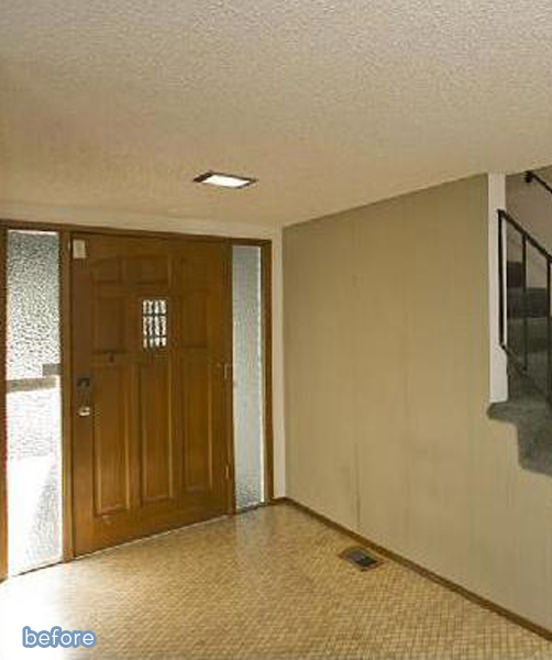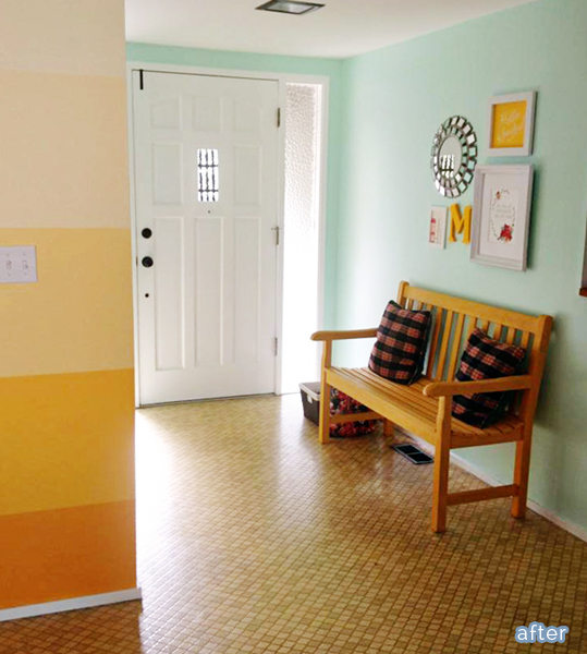 October 30, 2013 at 2:41 PMWhile the living room is a gorgeous make over the entry way is phenomenal. I would have wanted to get rid of that tile. The before was so dingy but the after is so cheerful.