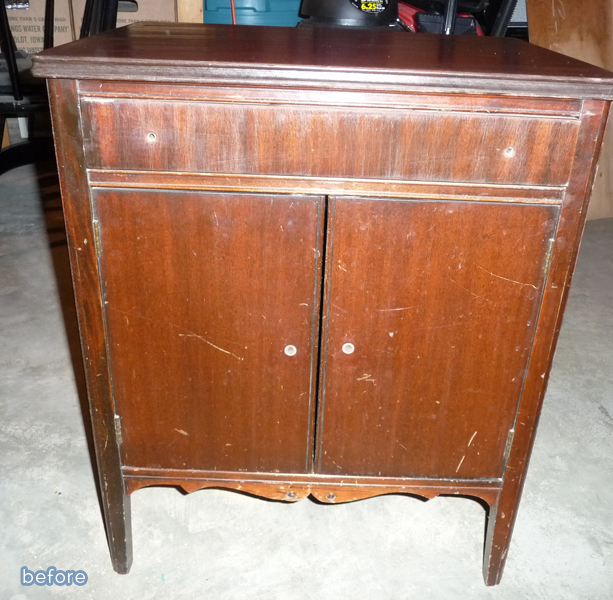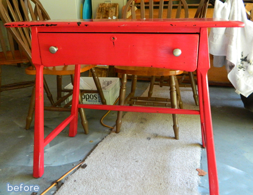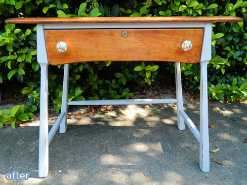 This little desk was kind of cute in it’s own red and chippy way, but when Julie got a closer look, she realized that the red paint extended sloppily into every nook and cranny. Inside, outside, front, back, drawer, keyhole — and was flaking off with reckless abandon too. Hours of endless stripping, scraping, and swearing ensued, but now she has a beautiful two-tone desk to show for it. Great knobs too. Heh heh.