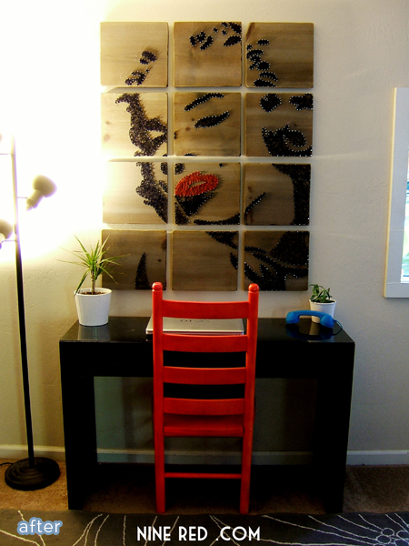 Jesse at Nine Red did one better, and created a huge custom piece of string art of … you’ll never guess … Marilyn Monroe! Talk about a boost of confidence for poor old nakey wall. Which reminds me of a fitting Marilyn quote … “It’s not true that I had nothing on. I had the radio on.”