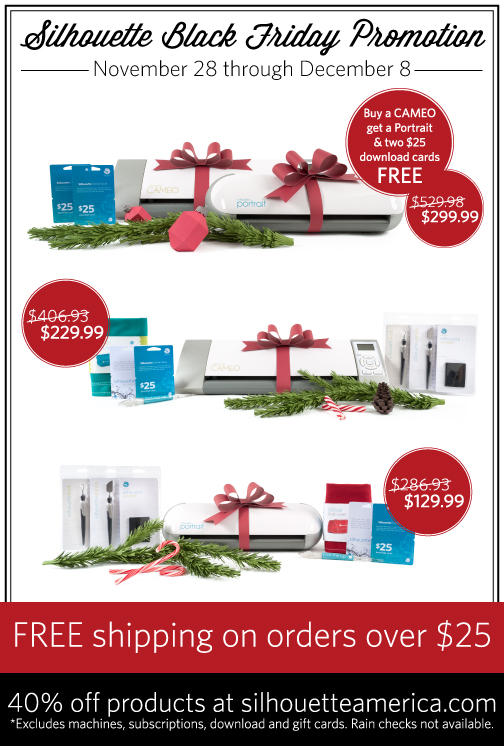 ★ A Silhouette CAMEO®, a Silhouette Portrait®, and two $25 download cards for $299.99. That’s right: If you buy a Silhouette CAMEO® at full price, you get two $25 download cards and a Silhouette Portrait® ABSOLUTELY FREE! Retail price for all of this would be $406.93 (over 40% savings!)