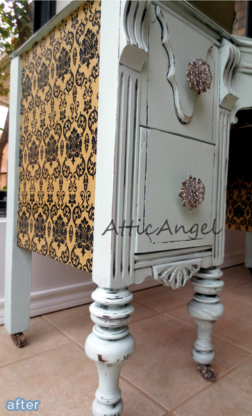 Isn’t that pretty? It’s gift wrap applied with a homemade modge podge! The knobs from Hobby Lobby were a splurge, but worth it. Beautiful job Stephanie! See more on her blog Attic Angel.