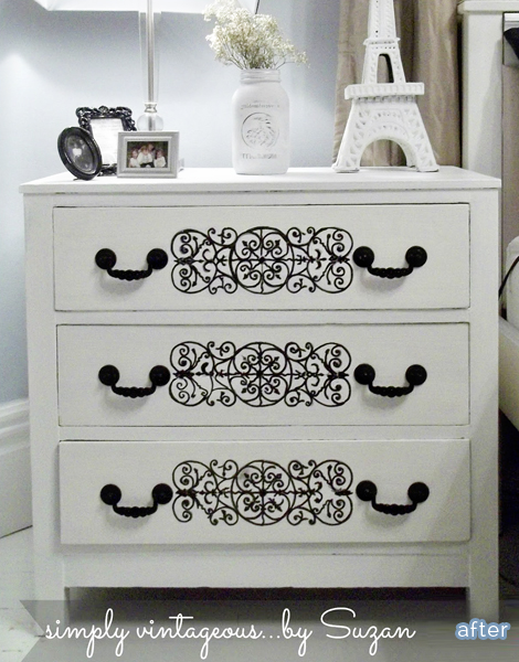 And Suzan at Simply Vintageous wanted to make the world a better place, so she took a look at this dresser and made a change! Woo! Woo! Na na naaa, na na naaa, na-na na-na. (That was me channeling my inner MJ, if you couldn’t tell). (Also, this paragraph has been hijacked by italics and I can’t for the life of me turn them off. Maybe it’s MJ’s ghost! He DOES approve!)