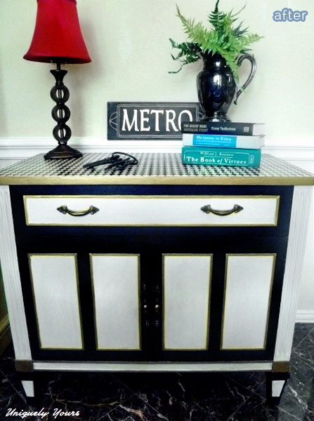 First, Better After reader Sonya dressed up this side table with black and white checkerboard and touches of gold for extra flair. Ch-mon! It looks fantastic.