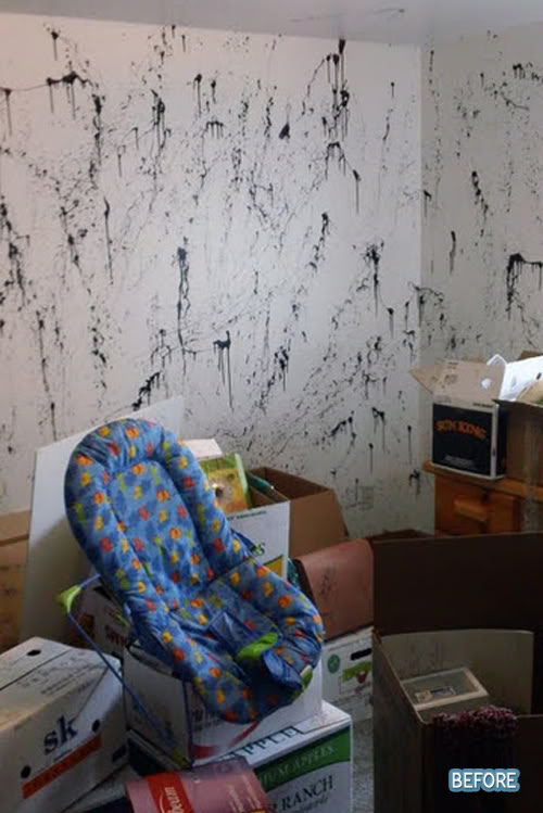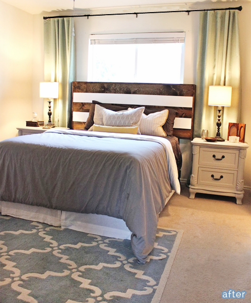 On the other hand … If you’d like the reverse effect, try Shelley’s solution. She rearranged the layout, swapped the mega-bed for a handmade headboard, painted the nightstands to add even more light, excused the rest of the furniture to go live somewhere else, and topped it off with some soothing colors and accessories. Ahhh. It can breathe again! Beautiful job Shelley.