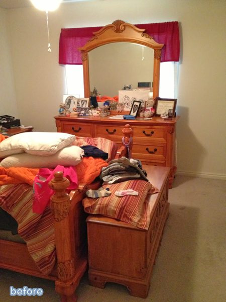 Step one: purchase a large furniture family consisting of a matching bed, dresser, mirror, two nightstands, and a trunk.