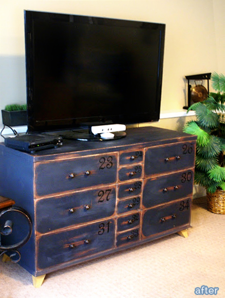 And finally, where I saw a dresser painted in a color that could only be called What Happens When Your Water Is Shut Off For 17 Hours, Jenny saw an apothecary-style media stand just waiting to emerge. Looks great and SO MUCH storage too! See more on her blog Ava Blake Creations.