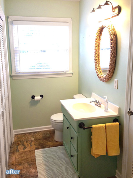 Not content to just rid the walls of their terra-cotta glow, Sarah also gave her tired old vanity an updated look with a deep mint. I probably would never have thought of a monochromatic match like this, but it really is a nice complement to the light mint walls. Hardware was simply updated with oil-rubbed bronze spray paint, one of my favorite tricks!